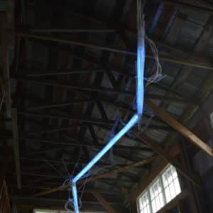 Twenty feet long, this one needs a biiiiiiig space! Good if you’ve got a long, tall hallway, a cathedral ceiling or loft. LED lights run through three acrylic tubes joined with heavy gauge wire, wrapped with strips of steel mesh and polycarbonate. Plugs in to a wall socket with a power supply unit; comes with remote. The artist intends that it cycle gradually through all the colours of the rainbow, but it is possible for you to set it to glow one steady colour. Artist will deliver and install in the Greater Toronto Area and within 150 km of Flesherton, Ontario. Cannot be shipped.